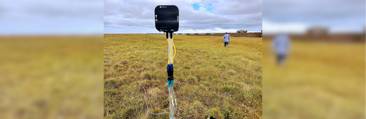 A close-up of a beadedstream digital temperature cable connected to a DL230 Data Logger. This logger provides reliable temperature data collection with extreme low power consumption and safe onboard flash storage at Wilkins Aerodrome.